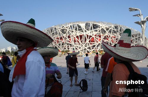 北京奧運接近尾聲,北京奧林匹克公園仍然人流不減。圖為戴著大草帽的墨西哥觀眾游覽公園。 中新社發(fā) 廖攀 攝