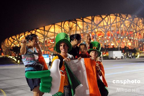 北京奧運(yùn)接近尾聲,深夜鳥(niǎo)巢外,外國(guó)觀眾拿著卡通道具與中國(guó)朋友歡樂(lè)交流。 中新社發(fā) 廖攀 攝