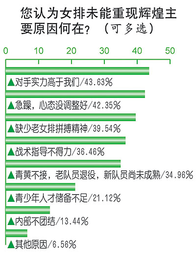 本次調(diào)查發(fā)現(xiàn),女排敗給對手,43.6%的人認(rèn)為是對手實力高于我們,42.4%的人認(rèn)為緣于我們自己急躁,沒有調(diào)整好心態(tài)。39.5%的人認(rèn)為,目前的女排缺少當(dāng)年老女排的拼搏精神。