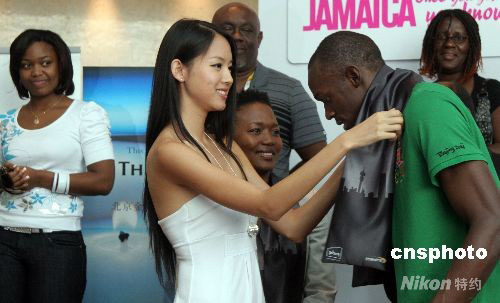 世界小姐張梓林向新科"飛人"博爾特贈送圍巾
