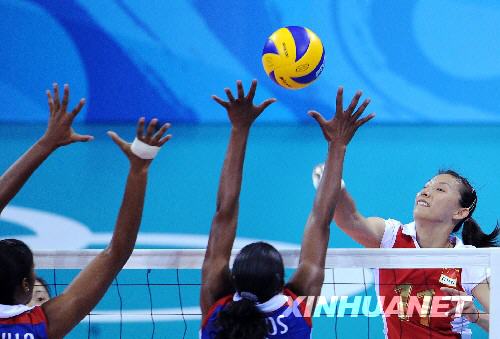 中國(guó)隊(duì)球員李娟(右)在比賽中扣球。新華社記者 趙眾志 攝