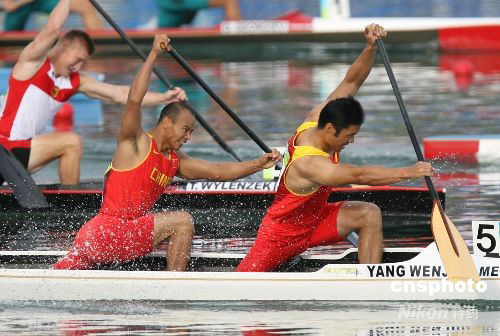 今天下午所有的比賽中,中國觀眾最關(guān)注的無疑是男子雙人劃艇500米比賽,因為雅典奧運會該項目冠軍孟關(guān)良、楊文軍將出戰(zhàn)。比賽一開始,孟關(guān)良、楊文軍就確立了領(lǐng)先優(yōu)勢,其他對手疲于追趕,但孟關(guān)良、楊文軍始終保持領(lǐng)先,最終以1分41秒025的成績蟬聯(lián)冠軍,也為中國代表團再添一枚金牌。