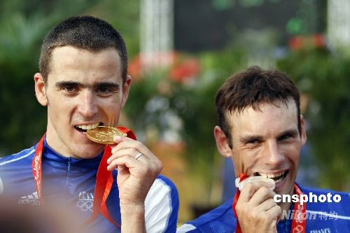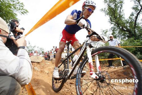 8月23日,在北京老山山地自行車場(chǎng)進(jìn)行的男子自行車越野賽中,法國(guó)名將朱利安-阿布薩隆(左)以1小時(shí)55分59秒成功衛(wèi)冕該項(xiàng)目的冠軍。法國(guó)另一位選手讓-克里斯托夫-佩羅(右)以1小時(shí)57分06秒的成績(jī)獲得銀牌。 中新社發(fā) 盛佳鵬 攝