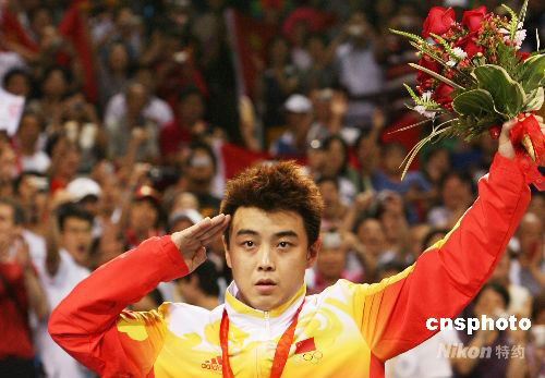 8月23日晚,王皓在北京奧運(yùn)會(huì)乒乓球男子單打決賽中以1:4負(fù)于隊(duì)友馬琳,奪得亞軍。圖為來自解放軍隊(duì)的王皓在領(lǐng)獎(jiǎng)臺(tái)上向觀眾行軍禮致謝。 中新社發(fā) 武仲林 攝