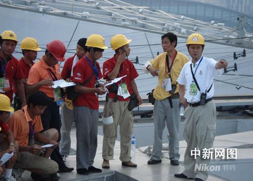 圖為工作人員在“鳥巢”進(jìn)行閉幕式煙火最后的安裝調(diào)試。 攝影:欣悅