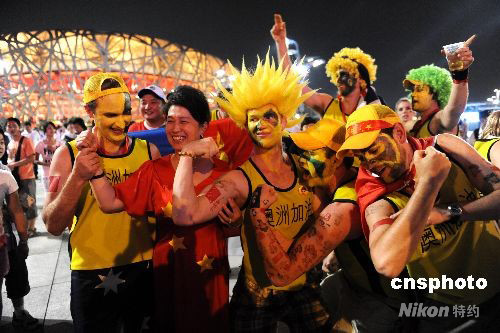 扮演超級賽亞人等電玩游戲人物的澳洲青年和中國朋友鳥巢前樂歡顏。