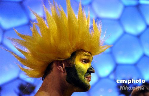 一位澳大利亞觀眾裝扮成“超級賽亞人”走在水立方外。