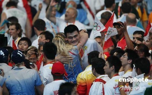 8月24日晚,北京奧運會閉幕式上,姚明友好的擁抱一位金發(fā)美女。中新社發(fā) 武仲林 攝
