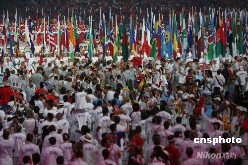 8月24日晚,北京奧運(yùn)會閉幕式在奧林匹克公園內(nèi)的國家體育場“鳥巢”舉行,各國運(yùn)動員入場。 中新社發(fā) 武仲林 攝