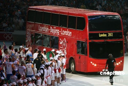 8月24日晚,北京奧運會閉幕式在奧林匹克公園內(nèi)的國家體育場舉行,下屆奧運會主辦城市倫敦市上演“倫敦8分鐘”演出,一輛倫敦標(biāo)志性的雙層紅色巴士駛?cè)搿傍B巢”體育場。中新社發(fā) 任晨鳴 攝