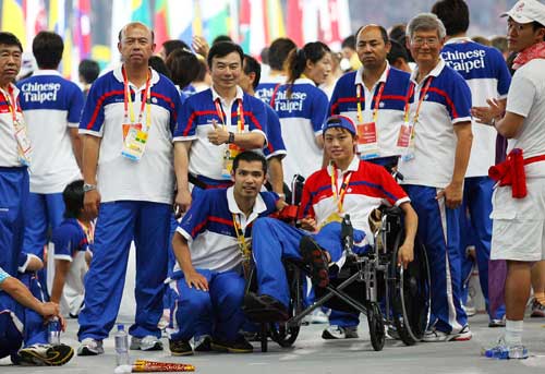 北京奧運二十四日晚間圓滿閉幕。中華臺北代表團七十多名隊職員參加閉幕式,備受矚目的跆拳道好手蘇麗文(前排右)坐著輪椅,由隊友推進場,成為中華臺北隊最受歡迎的選手。(“中央社”圖)