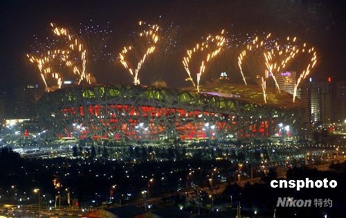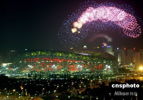 鳥巢上空燃放彩虹圖案焰火。 中新社發(fā) 王麗南 攝