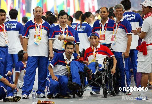 8月24日晚,北京奧運(yùn)會圓滿閉幕。中華臺北代表團(tuán)70多名隊員參加閉幕典禮,備受關(guān)注的跆拳道好手蘇麗文(前排右)坐著輪椅,由隊友推進(jìn)場,成為中華臺北隊最受歡迎的選手。 中新社發(fā) CNAsports 攝