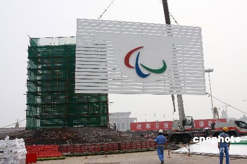 8月28日,北京殘奧會(huì)會(huì)徽開始在天安門廣場(chǎng)安裝。廣場(chǎng)東側(cè),20個(gè)殘奧會(huì)運(yùn)動(dòng)標(biāo)志取代了28個(gè)奧運(yùn)會(huì)運(yùn)動(dòng)標(biāo)志。輪椅橄欖球、輪椅籃球、硬地滾球、自行車、馬術(shù)等殘奧會(huì)運(yùn)動(dòng)造型初露。中新社發(fā) 追影 攝
