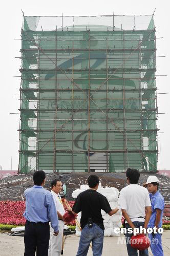 8月29日上午,北京天安門廣場(chǎng),正在安裝的殘奧會(huì)會(huì)徽“天地人”。據(jù)悉,離殘奧會(huì)會(huì)徽“天地人”揭幕還剩下最后測(cè)量階段。中新社發(fā) 王宇婷 攝