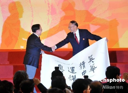 八月二十九日晚,香港特區(qū)政府在會(huì)展中心舉行酒會(huì)歡迎北京奧運(yùn)會(huì)內(nèi)地金牌運(yùn)動(dòng)員代表團(tuán)訪港。圖為特首曾蔭權(quán)向國(guó)家體育總局局長(zhǎng)、代表團(tuán)團(tuán)長(zhǎng)劉鵬致送一幅國(guó)學(xué)大師饒宗頤書寫的“奧運(yùn)精英 光耀中華”字畫。中新社發(fā) 鄧慶樂 攝