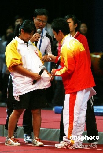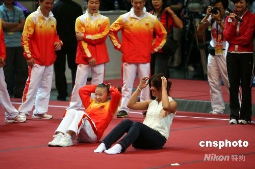 北京奧運會內(nèi)地金牌運動員代表團在香港伊麗莎白體育館作示范表演,并與青少年同樂。中新社發(fā) 洪少葵 攝