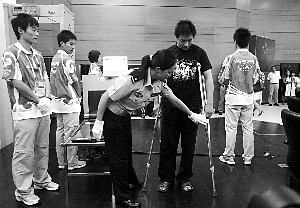 一名殘疾人雙手拄拐,站到“入口”處,一名安檢員接過他的拐杖,扶住他的身體,徒手檢查其身體各部位。昨日(8月31日)下午,數(shù)百名殘奧會(huì)場(chǎng)館安檢員在北京市殘聯(lián)接受“特訓(xùn)”,以適應(yīng)殘奧會(huì)期間的安檢需求。