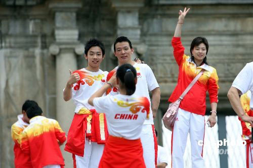 圖為國家舉重隊龍清泉、張湘祥等在景點合影。中新社發(fā) 洪少葵 攝