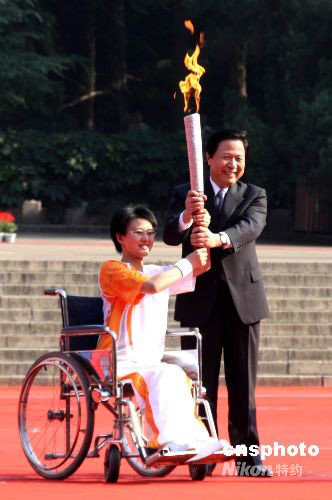 九月二日上午,北京殘奧圣火來到古都南京,受到民眾的熱烈歡迎。圖為江蘇省委書記梁保華將火炬?zhèn)鬟f給火炬手。 中新社發(fā) 牛莉 攝