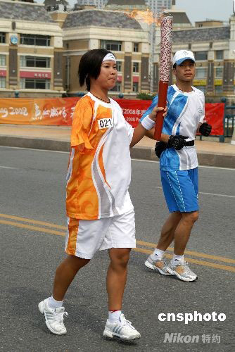 9月3日上午9時30分,以“超越、融合、共享”為主題和“點燃激情,奉獻關愛”為口號的北京殘奧會火炬,開始在中國北方美麗的海濱城市大連傳遞。圖為殘疾人火炬手傳遞火炬。中新社發(fā) 宋太盛 攝