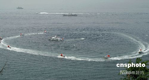 圖為殘奧火炬?zhèn)鬟f經(jīng)過大連濱海路時,海上表演項(xiàng)目為傳遞活動增色。 中新社發(fā) 宋太盛 攝