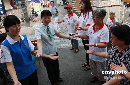 9月3日,北京市民在東四郵局門(mén)口與志愿者們一起學(xué)習(xí)手語(yǔ)“北京歡迎你”,迎接即將來(lái)臨的殘奧盛會(huì)。這一天,是北京殘奧會(huì)志愿服務(wù)的行動(dòng)日。中新社發(fā) 鄭雄增 攝