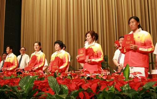 表彰會(huì)上,王峰等5名金牌運(yùn)動(dòng)員和教練員馬文輝、吳俐知被授予“山東青年五四杰出貢獻(xiàn)獎(jiǎng)?wù)隆,譚淼等獲得“山東省新長(zhǎng)征突擊手標(biāo)兵”榮譽(yù)稱號(hào)。王峰、奚愛華等還榮獲山東省“富民興魯”勞動(dòng)獎(jiǎng)?wù)路Q號(hào),張娟娟、奚愛華還獲山東省三八紅旗手標(biāo)兵榮譽(yù)稱號(hào)和“山東省先進(jìn)工作者”。王峰、杜麗、劉春紅以及獲得銀牌、銅牌的運(yùn)動(dòng)員被記一等功。