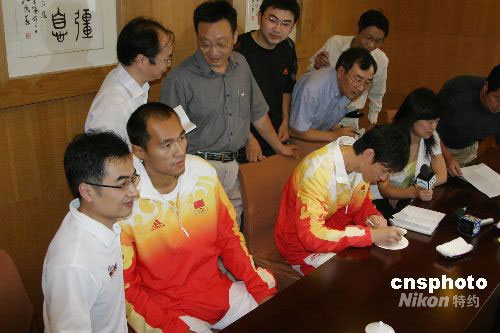 9月5日,北京奧運(yùn)會(huì)佩劍冠軍仲滿、沙灘排球運(yùn)動(dòng)員吳鵬根回到家鄉(xiāng)江蘇海安。當(dāng)?shù)嘏e行歡迎儀式迎接載譽(yù)回鄉(xiāng)的奧運(yùn)健兒,共同分享北京奧運(yùn)奪金的喜悅。中新社發(fā) 徐瑞平 攝