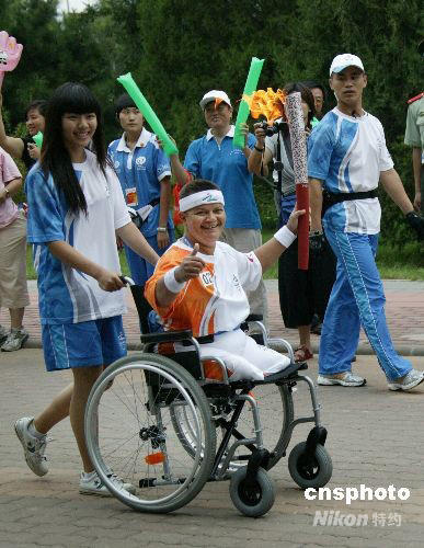 9月6日,殘奧會火炬結(jié)束在北京的傳遞,參加火炬?zhèn)鬟f的殘疾人占火炬手五分之一。中外殘疾人火炬手在傳遞中成了亮麗的風(fēng)景線,沿途觀眾為他們喝彩加油。 中新社發(fā) 馬毅行 攝