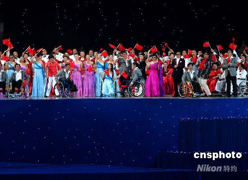 北京2008殘奧會(huì)開幕式將于9月6日晚8時(shí)在北京國(guó)家體育場(chǎng)“鳥巢”舉行,開幕式前,殘疾人藝術(shù)團(tuán)體及藝人登臺(tái)進(jìn)行文藝表演。 中新社發(fā) 宋吉河 攝