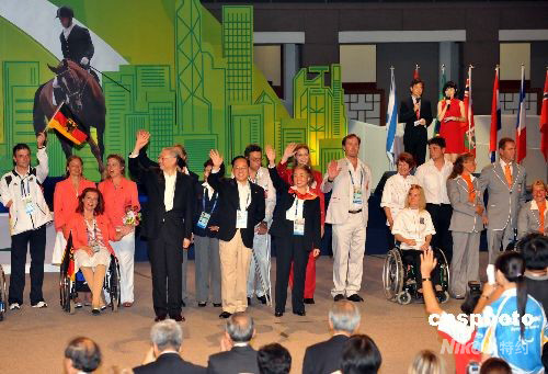 九月六日,北京二零零八年殘奧會(huì)馬術(shù)比賽開幕式在香港舉行歡迎晚會(huì),香港特區(qū)行政長官曾蔭權(quán)、殘奧村村長梁愛詩等嘉賓出席歡迎晚會(huì)。 中新社發(fā) 鄧慶樂 攝