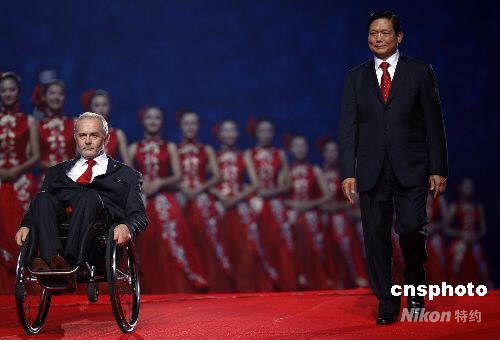 9月6日晚,北京2008年殘奧會(huì)開幕式在國(guó)家體育場(chǎng)“鳥巢”舉行,中國(guó)國(guó)家主席胡錦濤,國(guó)際殘奧委會(huì)主席菲利普.克雷文先生等出席開幕式。圖為北京奧組委主席劉淇,陪同國(guó)際殘奧委會(huì)主席菲利普.克雷文先生走向場(chǎng)地中心講臺(tái)準(zhǔn)備致辭。中新社發(fā) 杜洋 攝