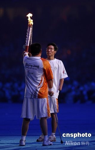 圖為武云虎點燃田徑運動員張宏偉手上的火炬。張宏偉曾經(jīng)在2000年悉尼殘奧會上獲得跳遠(yuǎn)和三級跳遠(yuǎn)兩枚金牌。中新社發(fā) 杜洋 攝