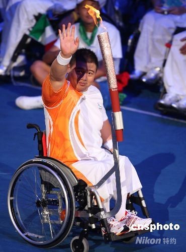 圖為殘疾運(yùn)動(dòng)員傳遞火炬。中新社發(fā) 宋吉河 攝
