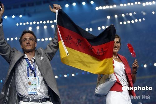 9月6日晚,北京2008殘奧會(huì)開(kāi)幕式在國(guó)家體育場(chǎng)“鳥(niǎo)巢”舉行。圖為德國(guó)選手入場(chǎng)時(shí)展示在國(guó)旗上用中文書(shū)寫(xiě)的“北京,你好”。中新社發(fā) 杜洋 攝
