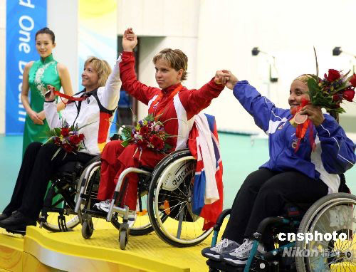 9月7日上午,北京2008殘奧會射擊R2級女子10米氣步槍立射-SH1項目的決賽中,斯洛伐克選手韋羅妮卡·瓦多維喬娃以494.8環(huán)領(lǐng)先第二名4.6環(huán)的成績摘得頭籌,摘得北京殘奧會上的第一枚金牌。中新社發(fā) 宋吉河 攝