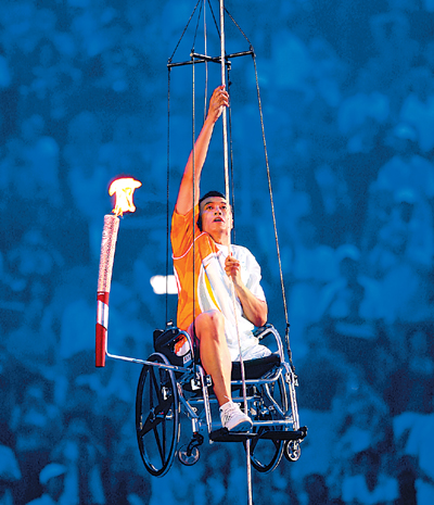 9月6日晚,“鳥(niǎo)巢”再次成為全球的焦點(diǎn)。殘疾人田徑運(yùn)動(dòng)員侯斌以震撼世界的方式,點(diǎn)燃了北京2008年殘奧會(huì)主火炬:他坐在輪椅上,將火炬安置在輪椅的火炬支架上,獨(dú)自拉緊繩索,牽動(dòng)著自己和所乘坐的輪椅緩緩向上攀升,用雙手完成了向主火炬的“攀登”。殘奧會(huì)主火炬點(diǎn)燃的一剎那,全場(chǎng)沸騰了……