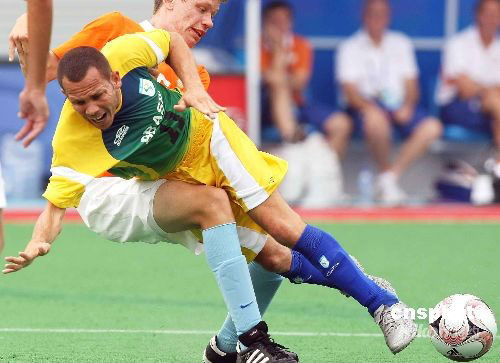 北京殘奧會七人制(男子)足球比賽9月8日在北京奧林匹克公園內(nèi)的橄欖球場開賽,在一場焦點比賽中,實力強大的巴西隊與荷蘭隊遭遇,最后巴西隊以1比0擊敗荷蘭隊。圖為巴西隊11號若澤·吉馬良斯突破防線后被人高馬大的荷蘭隊5號后衛(wèi)喬伊·門斯放倒。殘奧會七人制(男子)足球比賽在橄欖球賽場舉行,全場共60分鐘,隊員為腦癱患者。中新社發(fā) 任晨鳴 攝