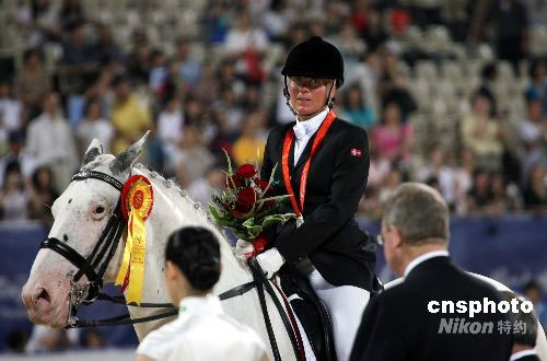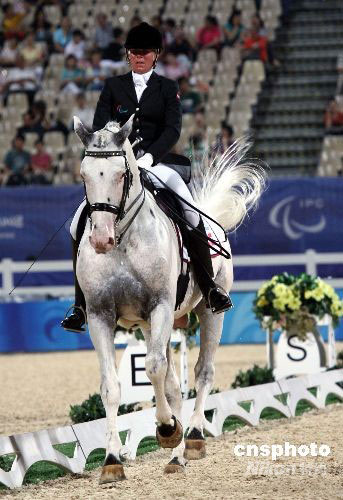 九月八日晚,來自挪威的選手安·呂貝在香港殘奧馬術(shù)IV級別-個人錦標(biāo)賽科目上獲得銀牌。在香港舉行為期五天的北京殘奧會馬術(shù)項目比賽,有來自二十八個國家和地區(qū)的七十三名選手及七十一匹參賽馬匹角逐十一枚金牌,參賽國家和地區(qū)數(shù)目、選手和馬匹數(shù)目都創(chuàng)歷史記錄。中新社發(fā) 洪少葵 攝