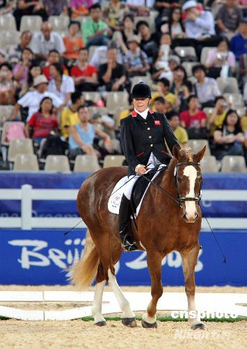 九月九日晚,在香港殘奧馬術(shù)“盛裝舞步團(tuán)體賽”個(gè)人錦標(biāo)賽級(jí)別Ia,英國(guó)選手安妮·鄧納姆策騎馬匹“特迪”表現(xiàn)出色,奪得金牌。為期五天的北京殘奧會(huì)馬術(shù)項(xiàng)目,有來(lái)自二十八個(gè)國(guó)家和地區(qū)的七十三名選手及七十一匹參賽馬匹角逐十一枚金牌,參賽國(guó)家和地區(qū)數(shù)目、選手和馬匹數(shù)目都創(chuàng)歷史記錄。 中新社發(fā) 鄧慶樂(lè) 攝