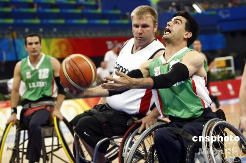 9月11日,北京殘奧會(huì)男子輪椅籃球小組賽A組加拿大隊(duì)與伊朗隊(duì)的比賽在北京國家體育館進(jìn)行,最終加拿大93比62戰(zhàn)勝伊朗。中新社發(fā) 盛佳鵬 攝