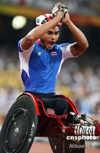 9月11日晚,北京殘奧會(huì)田徑比賽繼續(xù)在奧林匹克公園內(nèi)的國(guó)家體育場(chǎng)“鳥(niǎo)巢”舉行,在男子5000米-T54級(jí)決賽中,泰國(guó)選手巴越·沃霍倫一路領(lǐng)先,并在最后時(shí)刻頂住各路選手的反撲,在這個(gè)一直被歐美強(qiáng)手統(tǒng)治的項(xiàng)目中奪得冠軍。中新社發(fā) 任晨鳴 攝
