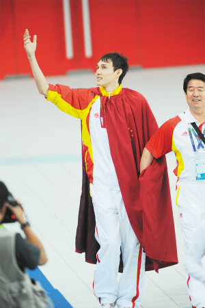 雖然最終收獲的還是“銀鑲玉”,但是楊博尊的心情已和8日晚有著天壤之別,臉上掛滿了笑容!斑@雖然不是我的主項,但是我發(fā)揮得很好,超越了自己。現(xiàn)在我終于知道,‘水立方’不僅有‘金鑲玉’,還有更多的是超越。無論是我,還是我的隊友,我們都很努力,都在不斷地超越自己!迸d奮的楊博尊披上了早就準備好的“戰(zhàn)袍”,這本是他為自己奪冠時準備的。