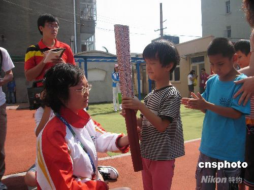 雖然眼睛看不見,但阻擋不了自己對(duì)奧運(yùn)的渴望。九月十二日,殘奧會(huì)火炬來到了青島市盲人高級(jí)中學(xué),進(jìn)行了一場(chǎng)特殊的火炬?zhèn)鬟f,全校一百九十多個(gè)孩子一一親手撫摸火炬,感受奧運(yùn)魅力。圖為盲童在撫摸火炬。中新社發(fā) 修建華 攝