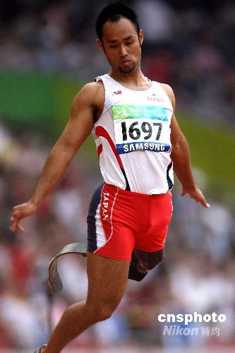 北京殘奧會田徑比賽9月16日繼續(xù)在北京奧林匹克公園內(nèi)的國家體育場--鳥巢舉行,F(xiàn)42級別的日本選手山本篤在男子跳遠(yuǎn)-F42/44級別決賽中以5.84米、989分的成績獲得亞軍。中新社發(fā) 任晨鳴 攝