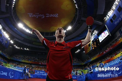 9月11日,北京殘奧會乒乓球男子M6決賽中,丹麥選手皮特·羅森邁耶以3比1戰(zhàn)勝了德國選手丹尼爾獲得冠軍,賽后他興奮的振臂吶喊。中新社發(fā) 杜洋 攝