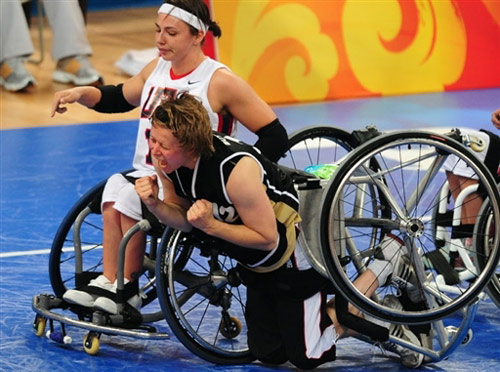 9月8日,在北京殘奧會(huì)女子輪椅籃球A組預(yù)賽中,美國(guó)隊(duì)最終以42:38艱難逆轉(zhuǎn)德國(guó)隊(duì)。圖為德國(guó)隊(duì)的瑪倫·巴特布羅特在裁判判罰美國(guó)隊(duì)斯蒂芬妮·惠勒犯規(guī)后,興奮吶喊。