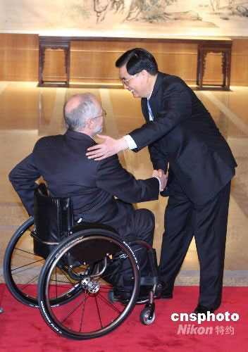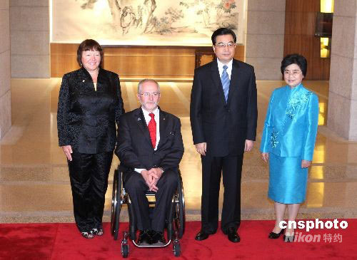 9月17日,中國(guó)國(guó)家主席胡錦濤與夫人劉永清在北京釣魚臺(tái)國(guó)賓館芳菲苑舉行宴會(huì)歡迎出席北京殘奧會(huì)閉幕式的國(guó)際貴賓。圖為胡錦濤與夫人迎接殘奧委會(huì)主席克雷文夫婦。中新社發(fā) 廖文靜 攝