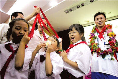昨天,在殘奧會(huì)上收獲2金2銀1銅的中國(guó)運(yùn)動(dòng)員何軍權(quán)來(lái)到北京精誠(chéng)實(shí)驗(yàn)小學(xué),向小學(xué)生們展示他獲得的“金鑲玉”。作為該校的校外輔導(dǎo)員,何軍權(quán)與他們一起分享了自己在殘奧會(huì)上收獲的榮譽(yù)和感動(dòng),講述了自己的奮斗經(jīng)歷。失去雙臂的他成為孩子們心目中的英雄。何軍權(quán)說(shuō),北京殘奧會(huì)是他最后一次參加國(guó)際比賽,之后他將回到湖北荊門市殘聯(lián)工作。